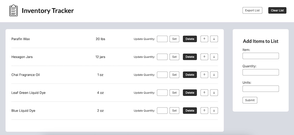 A simple inventory tracker that allows you to export your list into a CSV file.