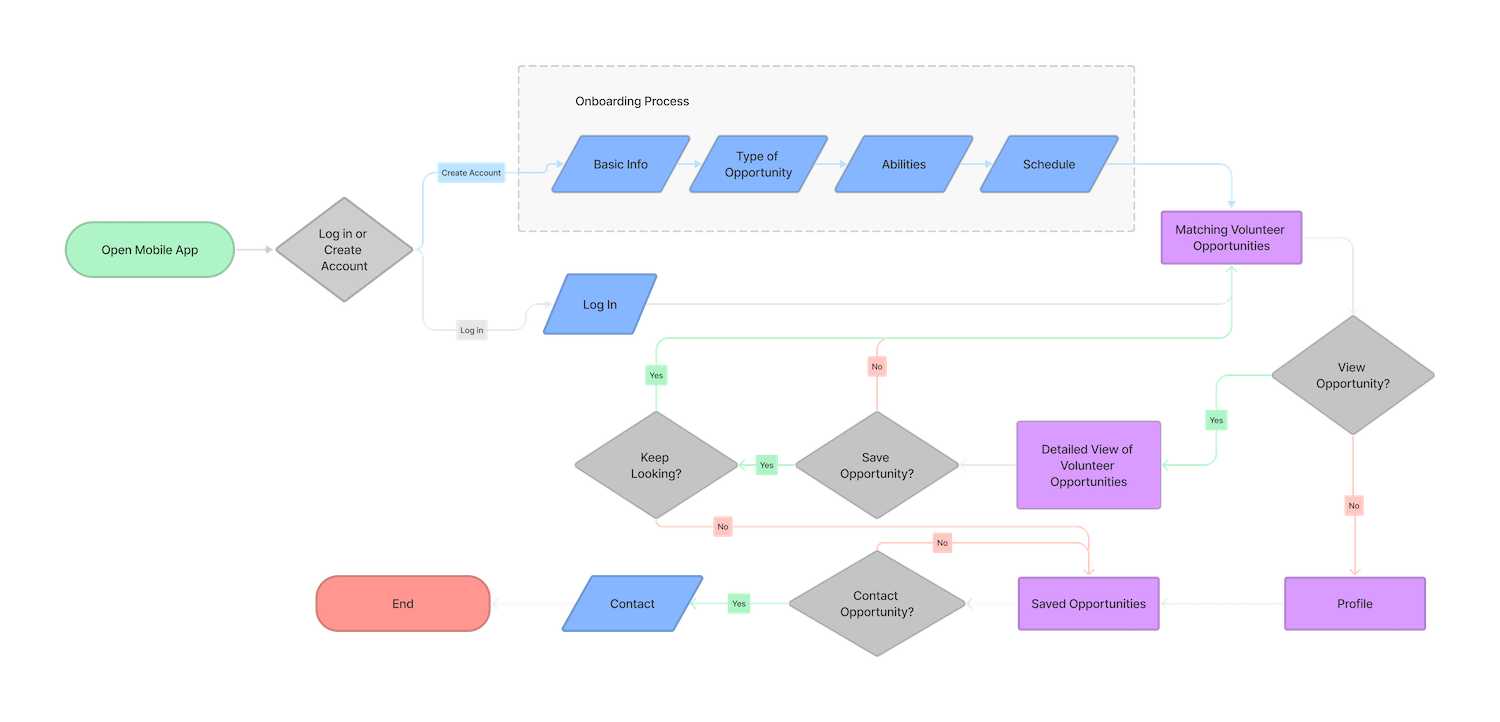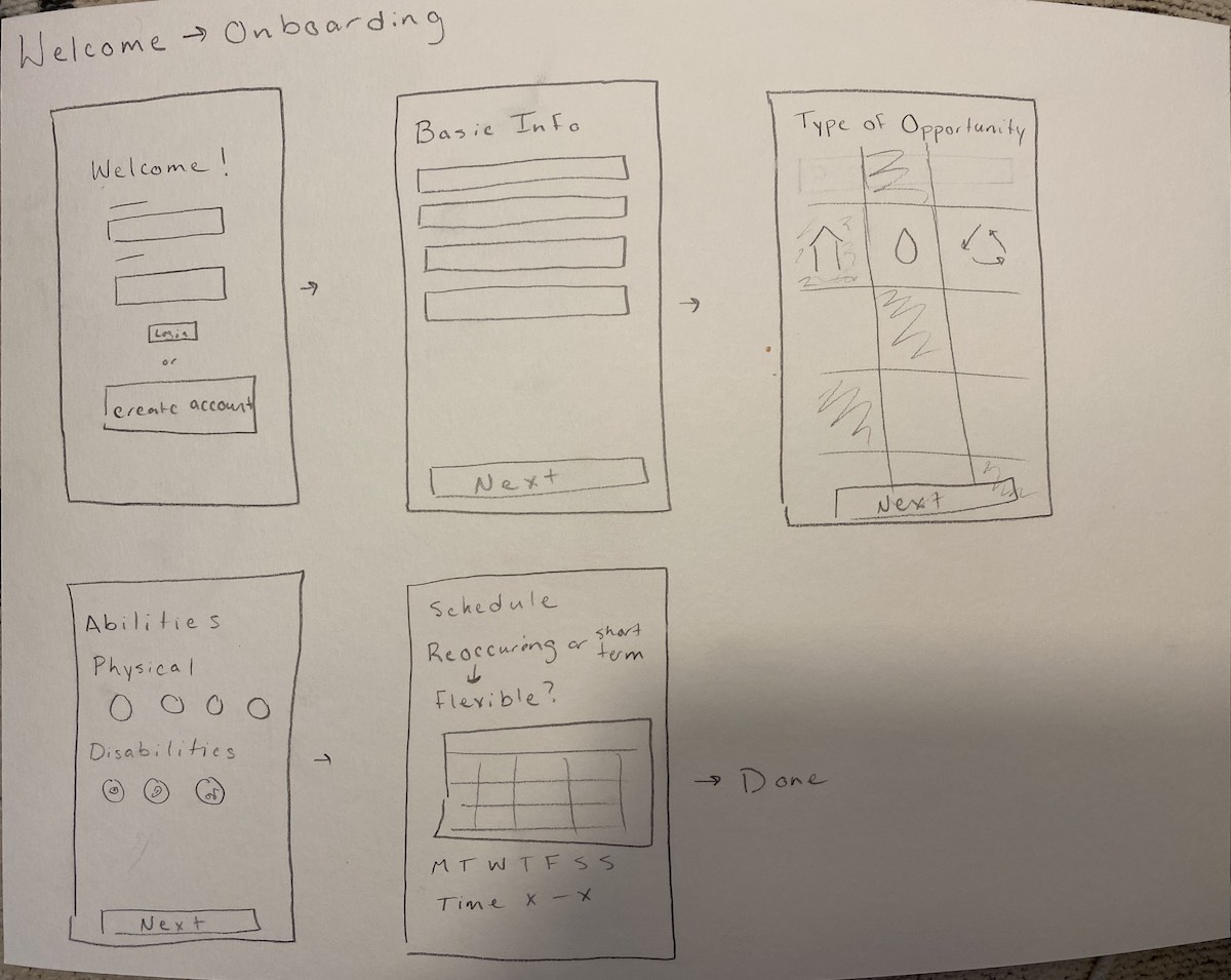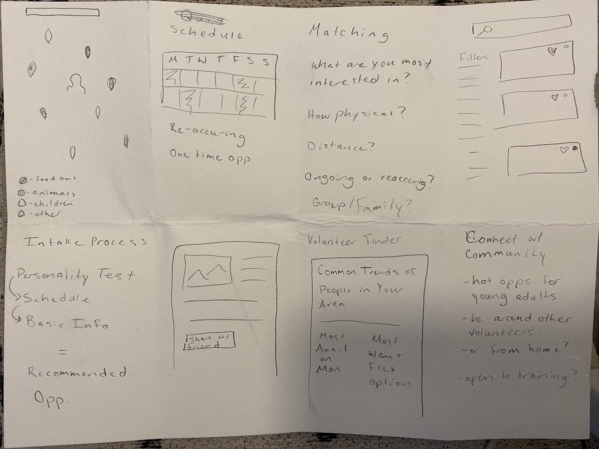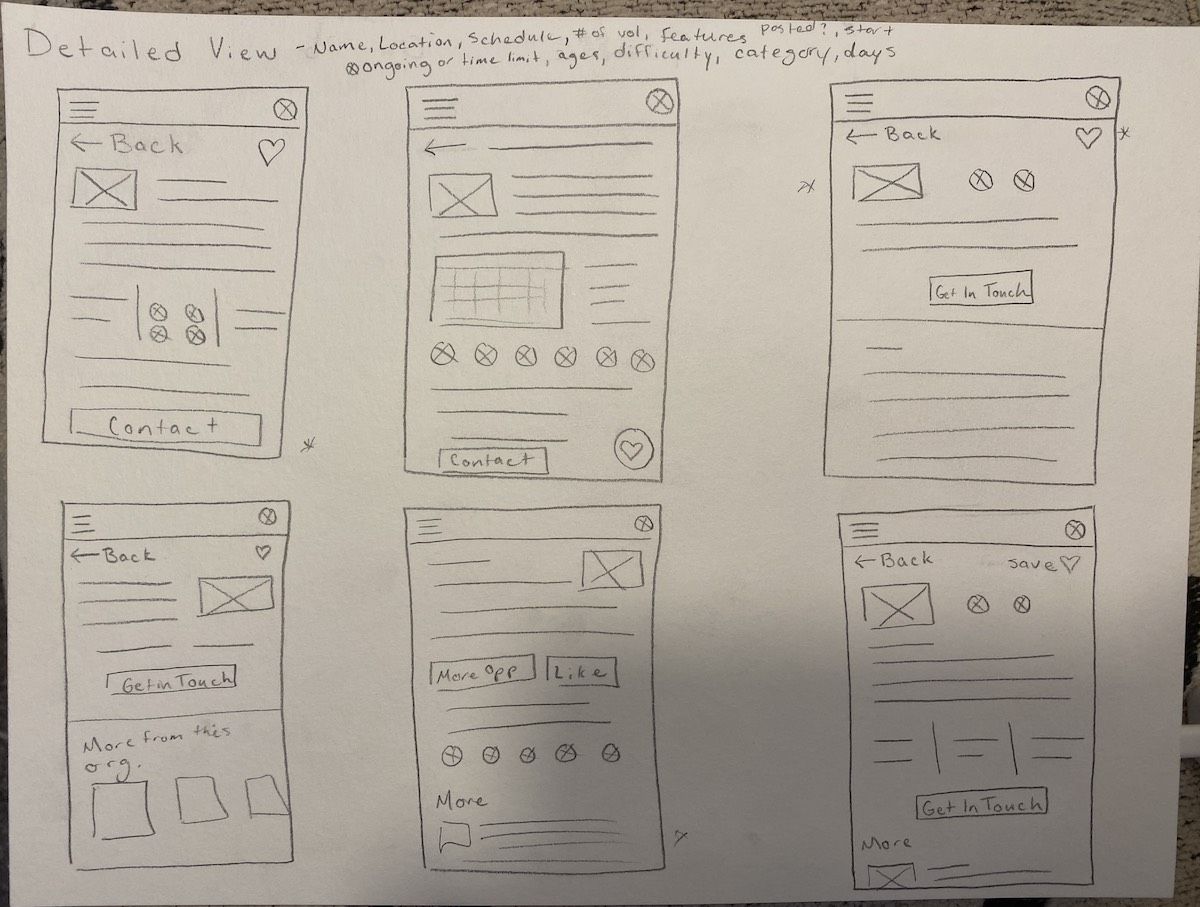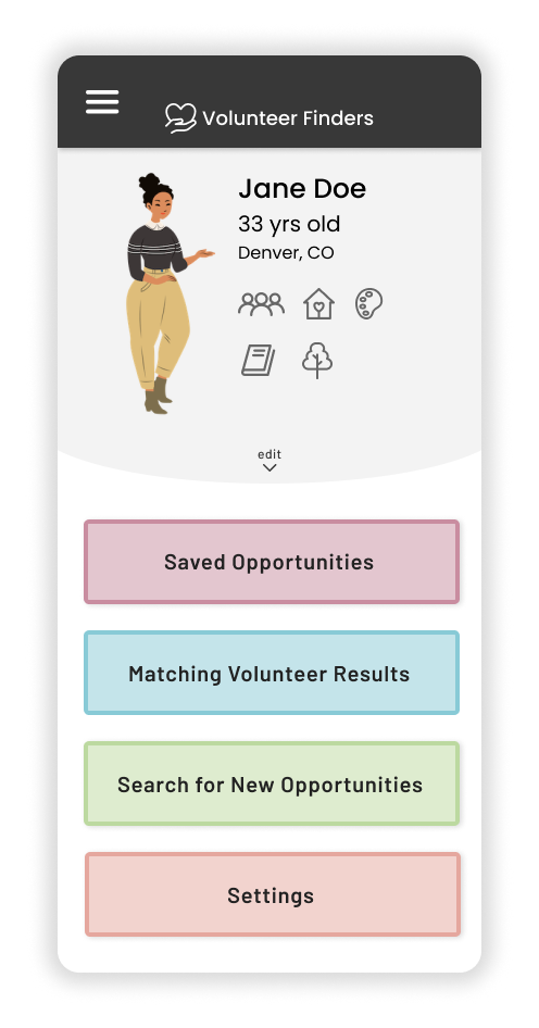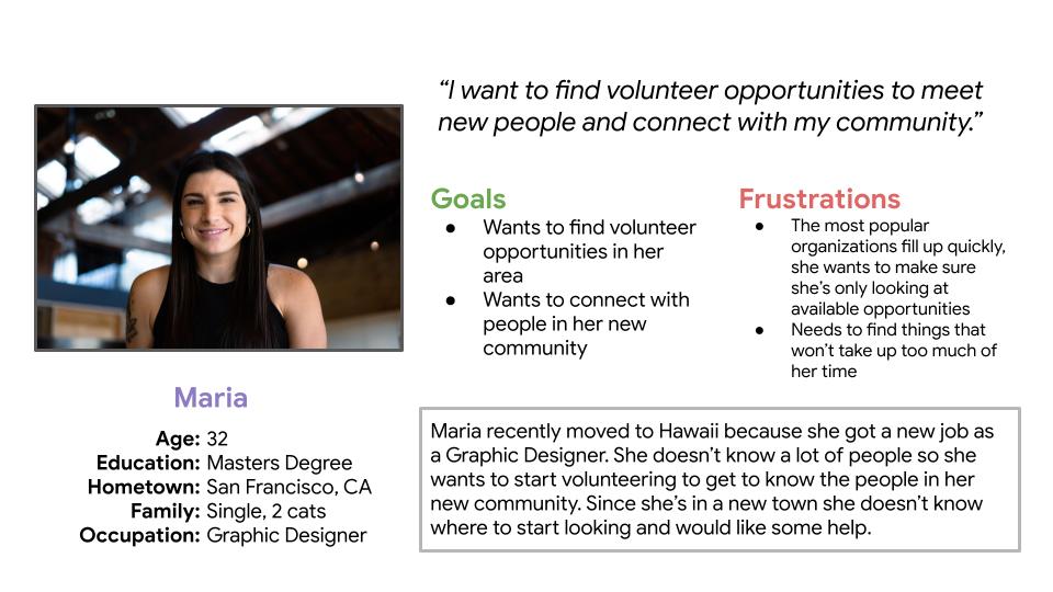 While performing user research I learned about the unique needs that each of my users might have when they’re looking for a volunteer opportunity. For example, if an older person is looking for a volunteer opportunity they might be concerned about how far it is and how much physical activity they’ll need to do, where as a younger adult with a busier schedule might be more concerned about how much time the opportunity takes.