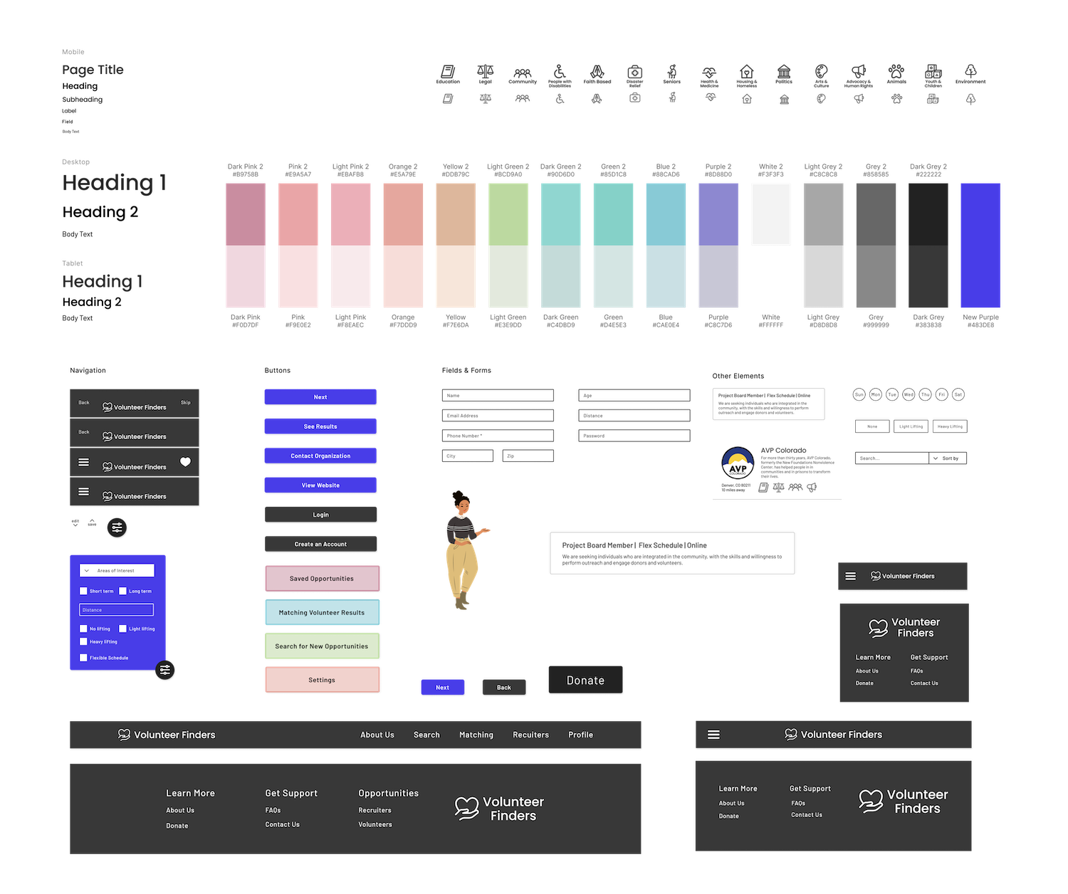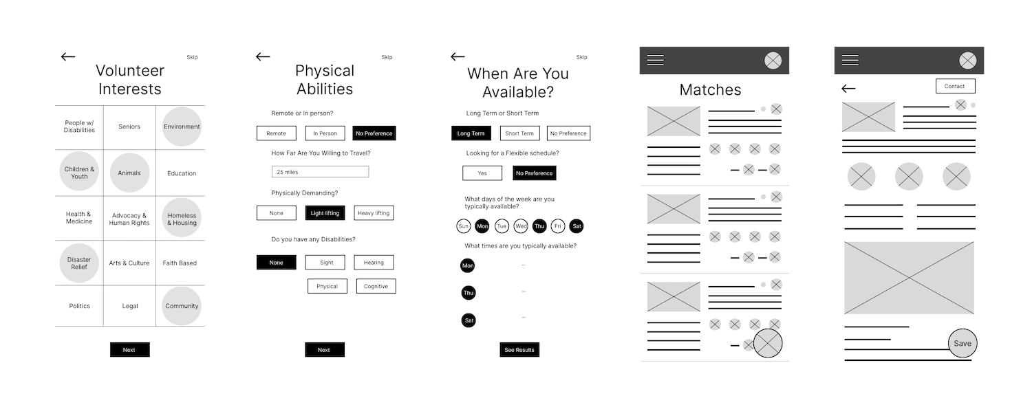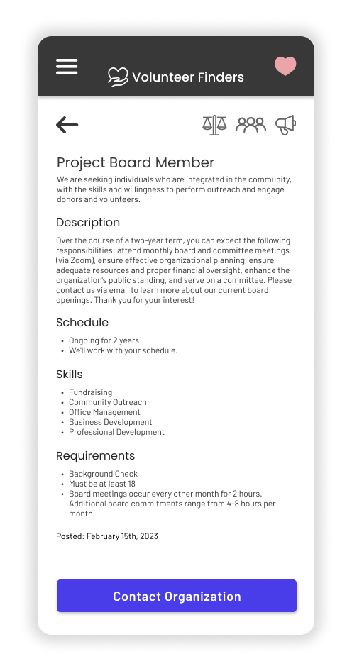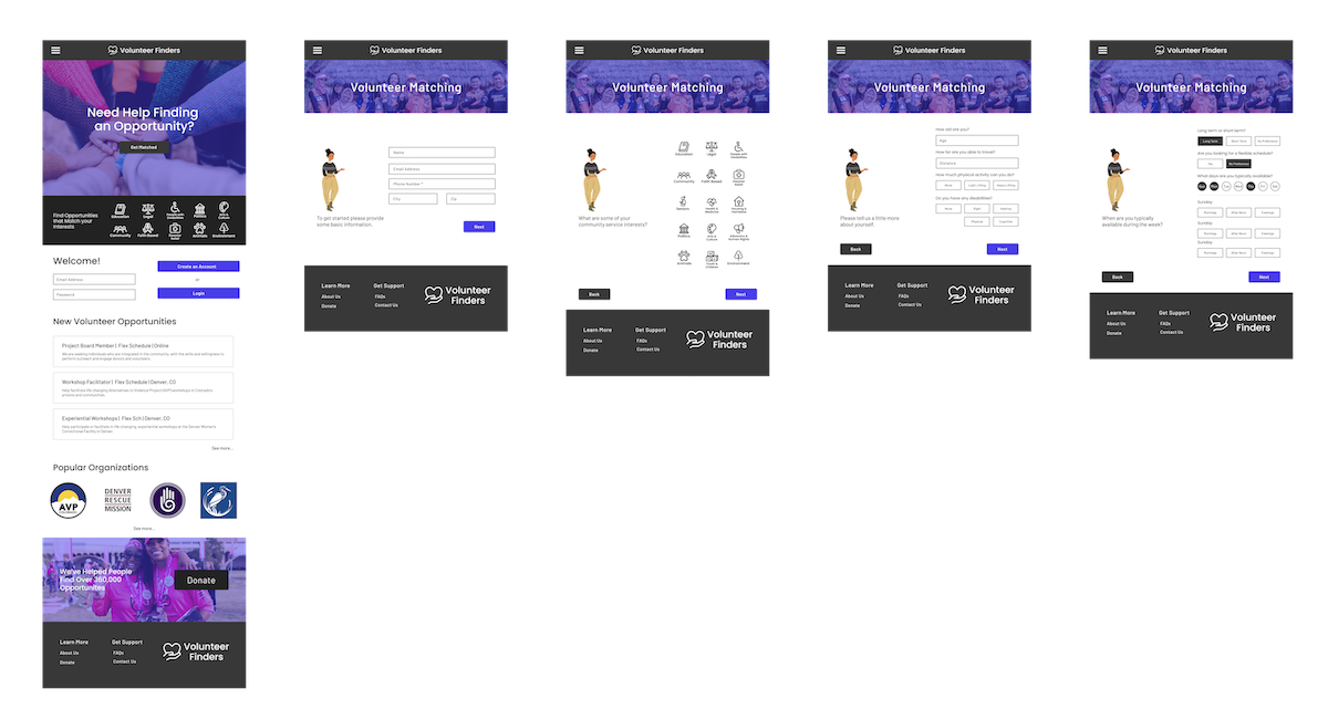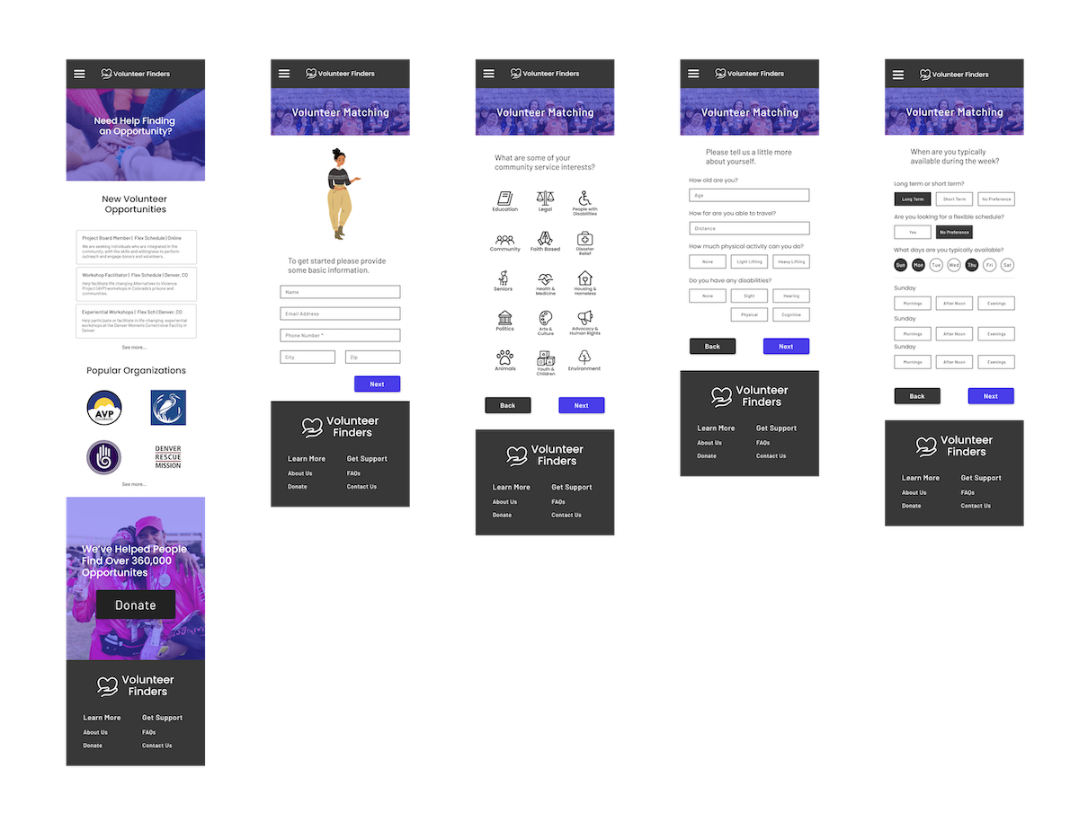 While performing user research I learned about the unique needs that each of my users might have when they’re looking for a volunteer opportunity. For example, if an older person is looking for a volunteer opportunity they might be concerned about how far it is and how much physical activity they’ll need to do, where as a younger adult with a busier schedule might be more concerned about how much time the opportunity takes.