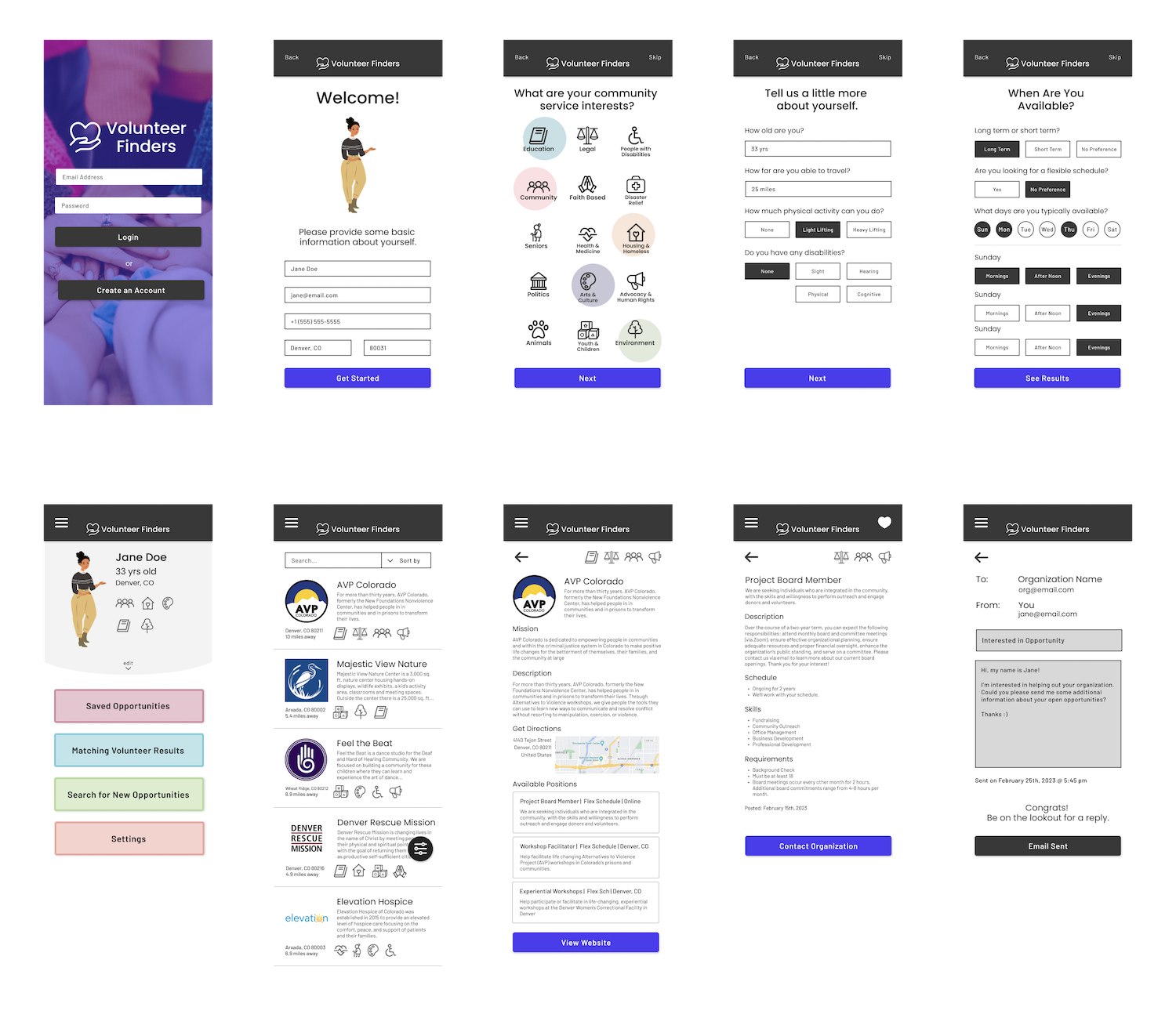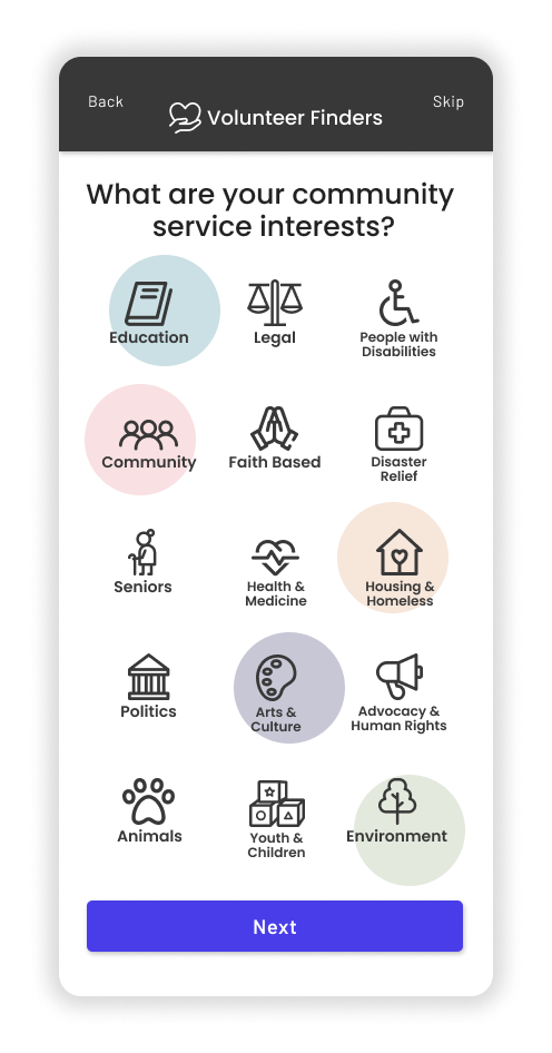 Solution: Volunteer Finders helps fix that problem by asking you a series of questions and matching you with available volunteer opportunities in your area.