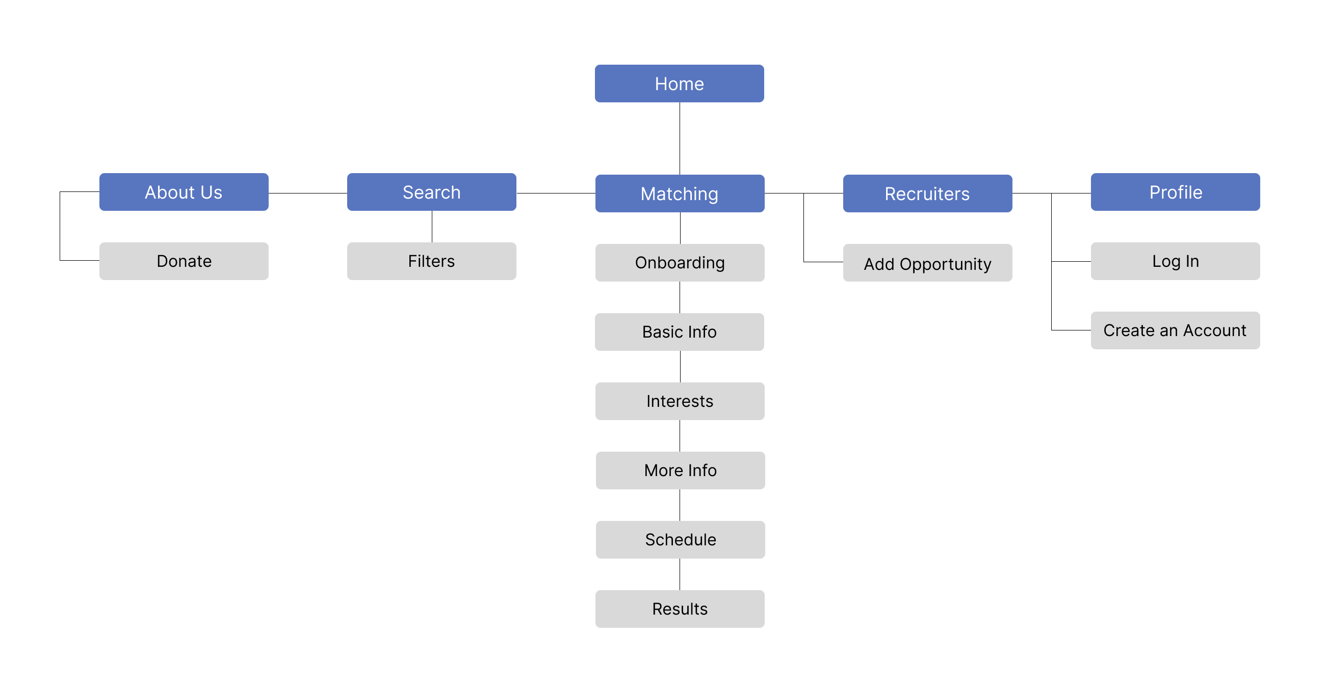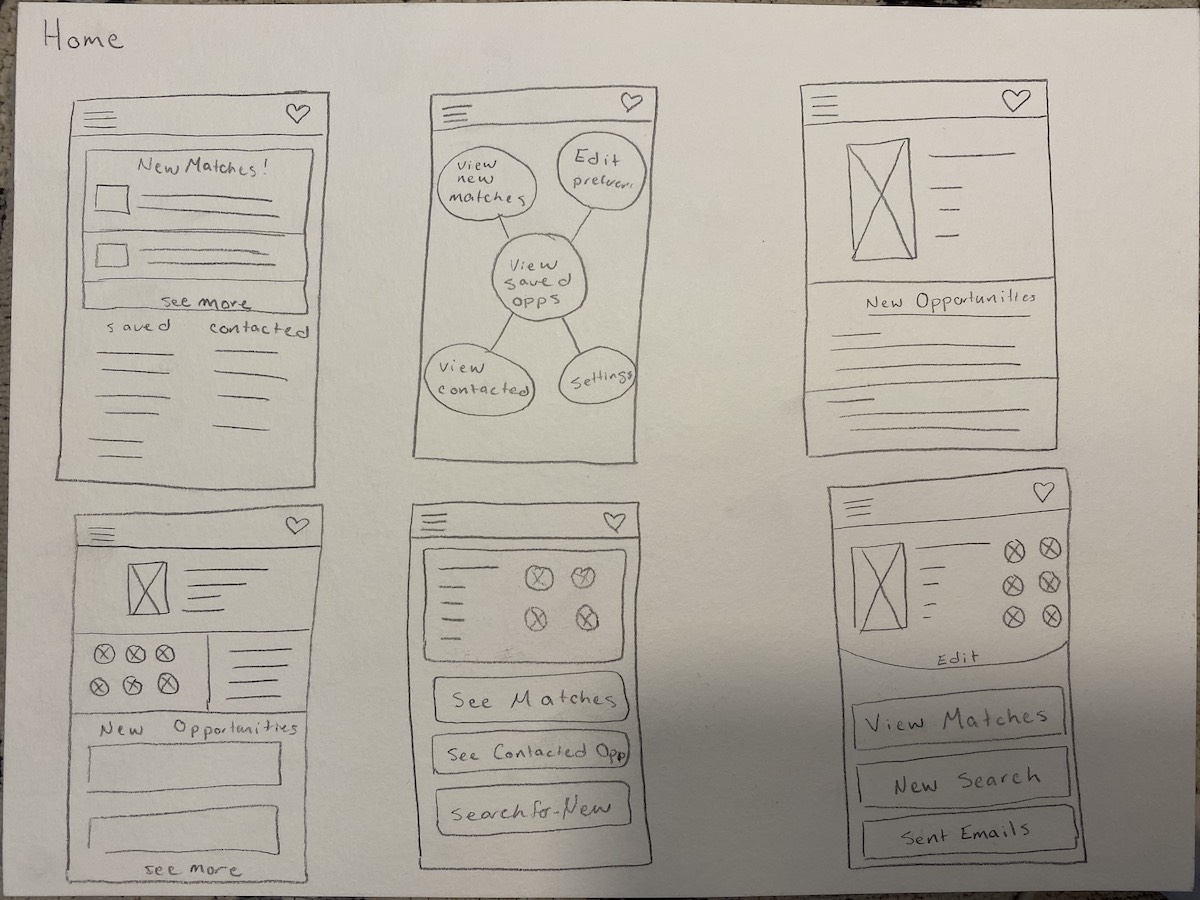 I got pretty good feedback from user testing, but it was clear I needed to make some signifcant design changes before moving on in the process. A lot of my testers were getting stuck after they got through the onboarding process, it wasn't really clear how to navigate the app once they got to the matching page. I decided to add a home screen to my design to help with user flow, initially I didn't think it was going to be necessary but I ended up combining my original concept for a profile page with buttons to assist with navigation to create a home screen.